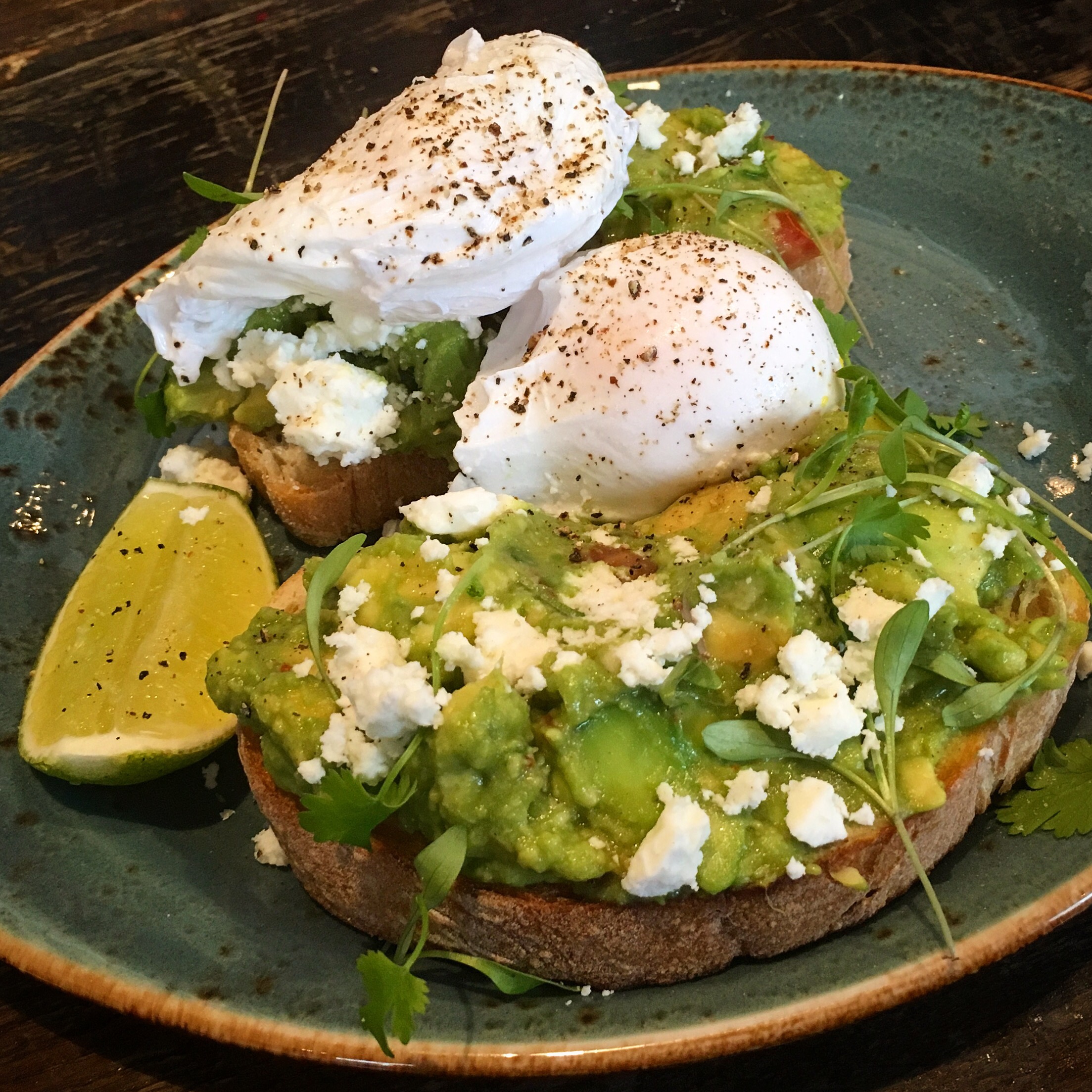 Order: Avocado on toast with extras (£10.50)- garlic, chilli, tomato, ciabatta with poached eggs and feta.